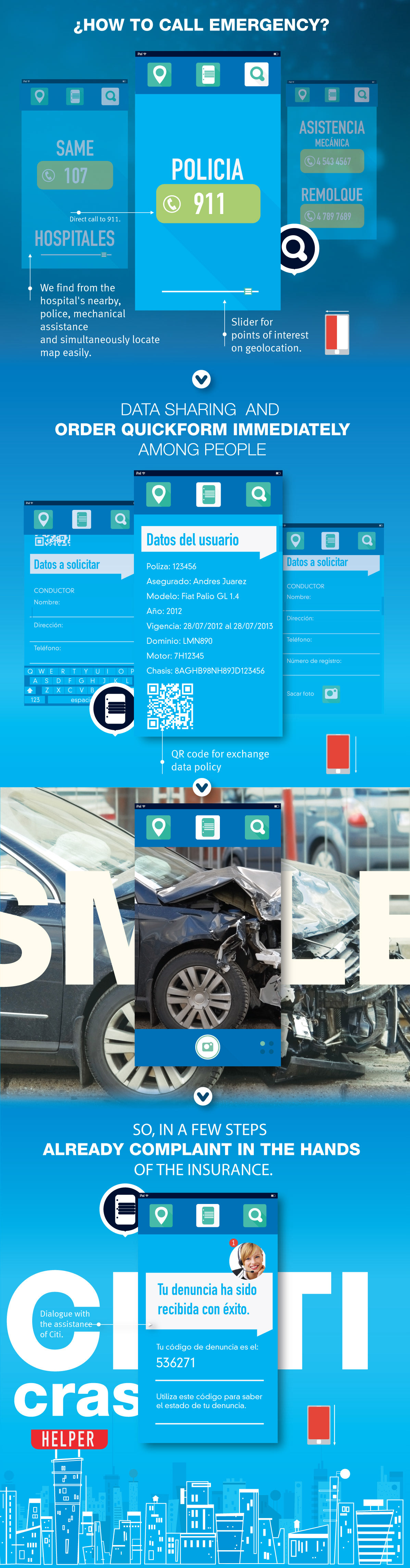 It´s a project presented to Citibank, who needed an app to help their clients when crashing their car. This app provides not only the assistance of the bank, but also the police assistance, fire, mechanical service and geolocation.